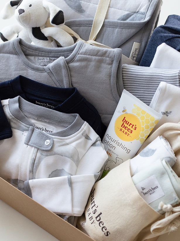 Collection of Burt's Bees Baby Spring collection children's clothing and accessories on a wooden surface