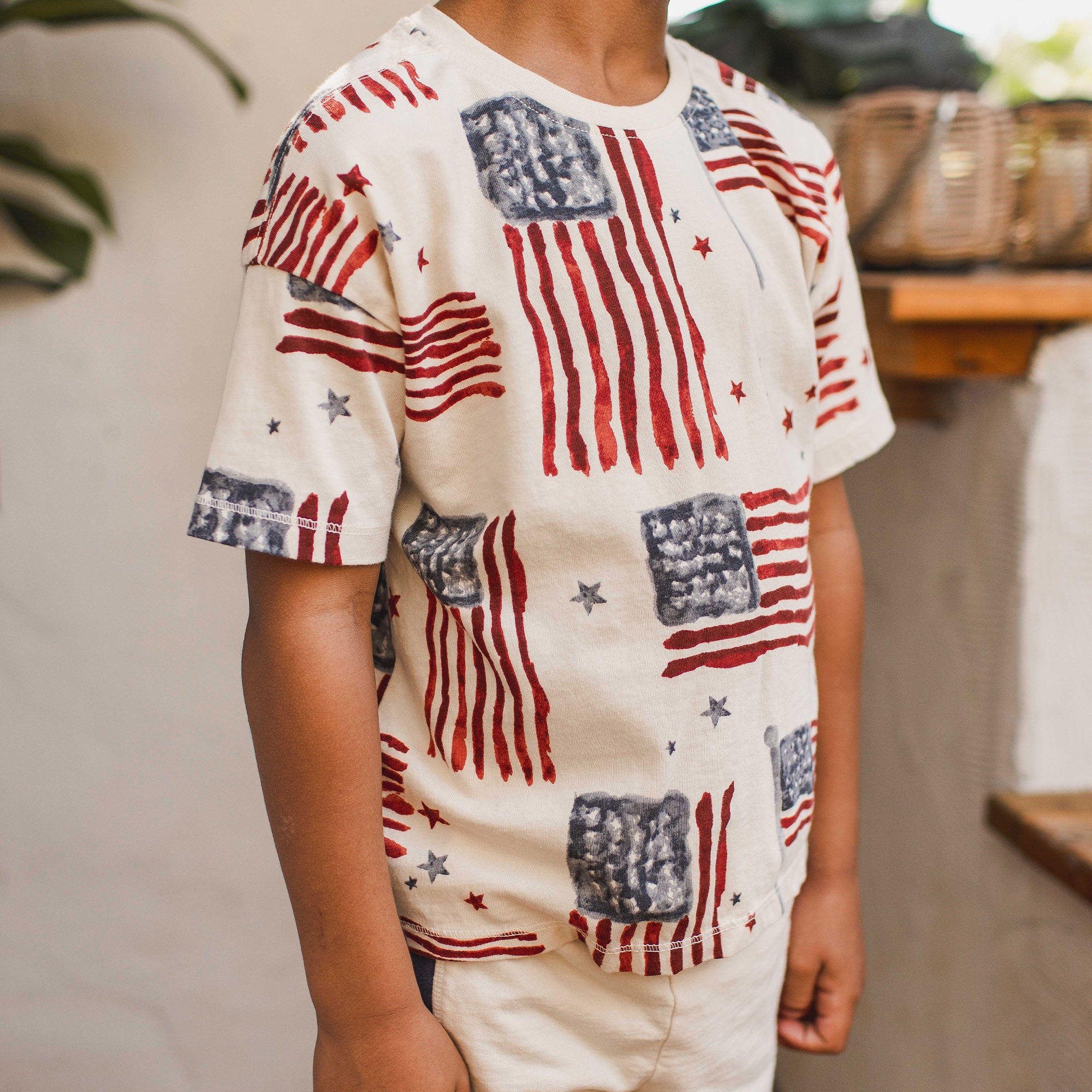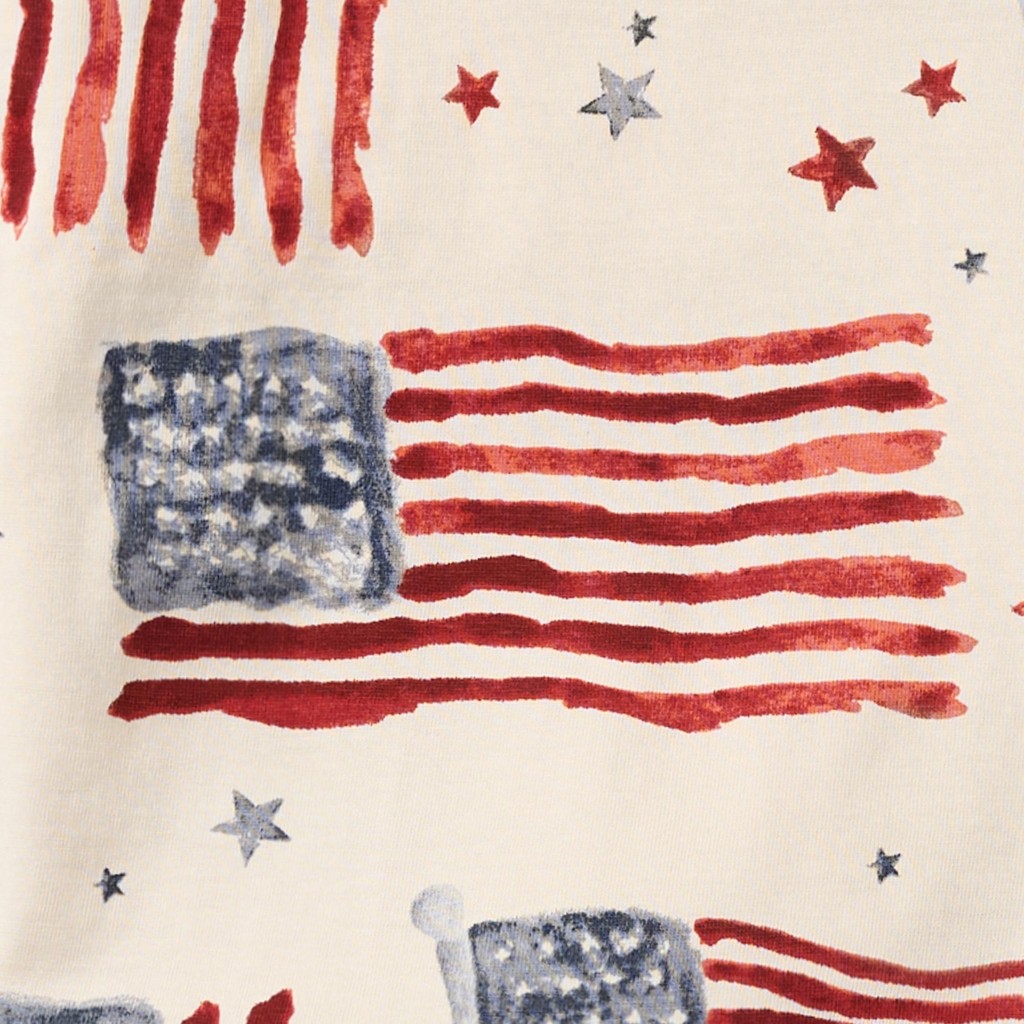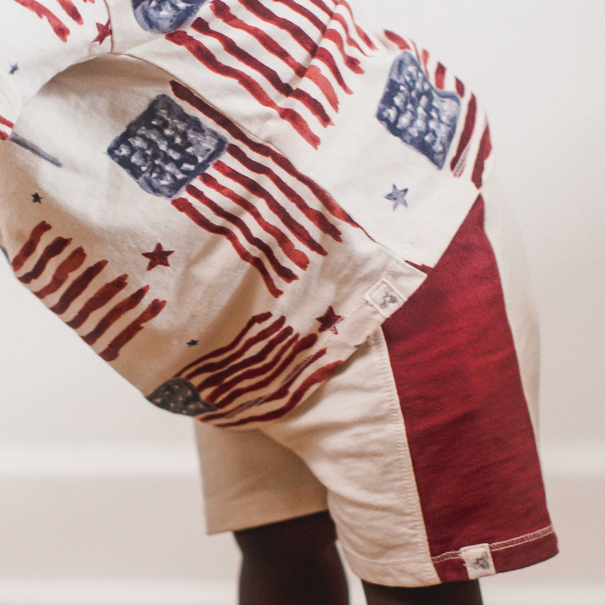 This oversized jersey tee features hand‑painted flags that feel extra fun and vintage, paired with french terry shorts that add fun pops of color.