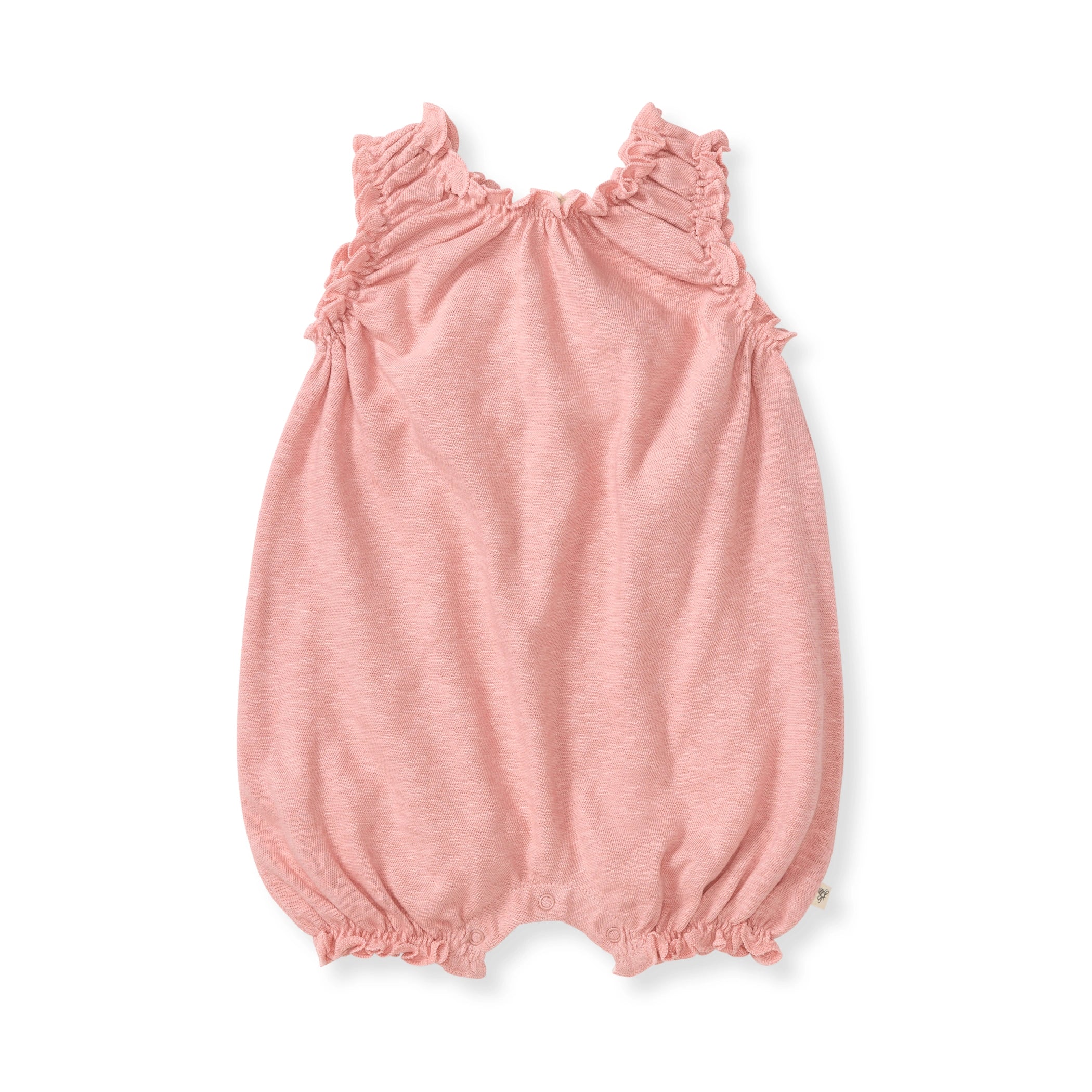 Your little one will stay comfy and cute in this pink chunky slub romper, finished with short sleeves, short legs, and a pretty frill around the edges and collar for extra sweetness.