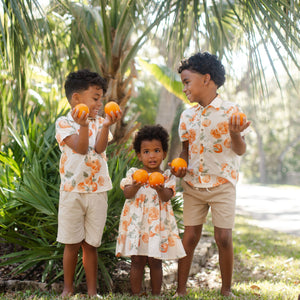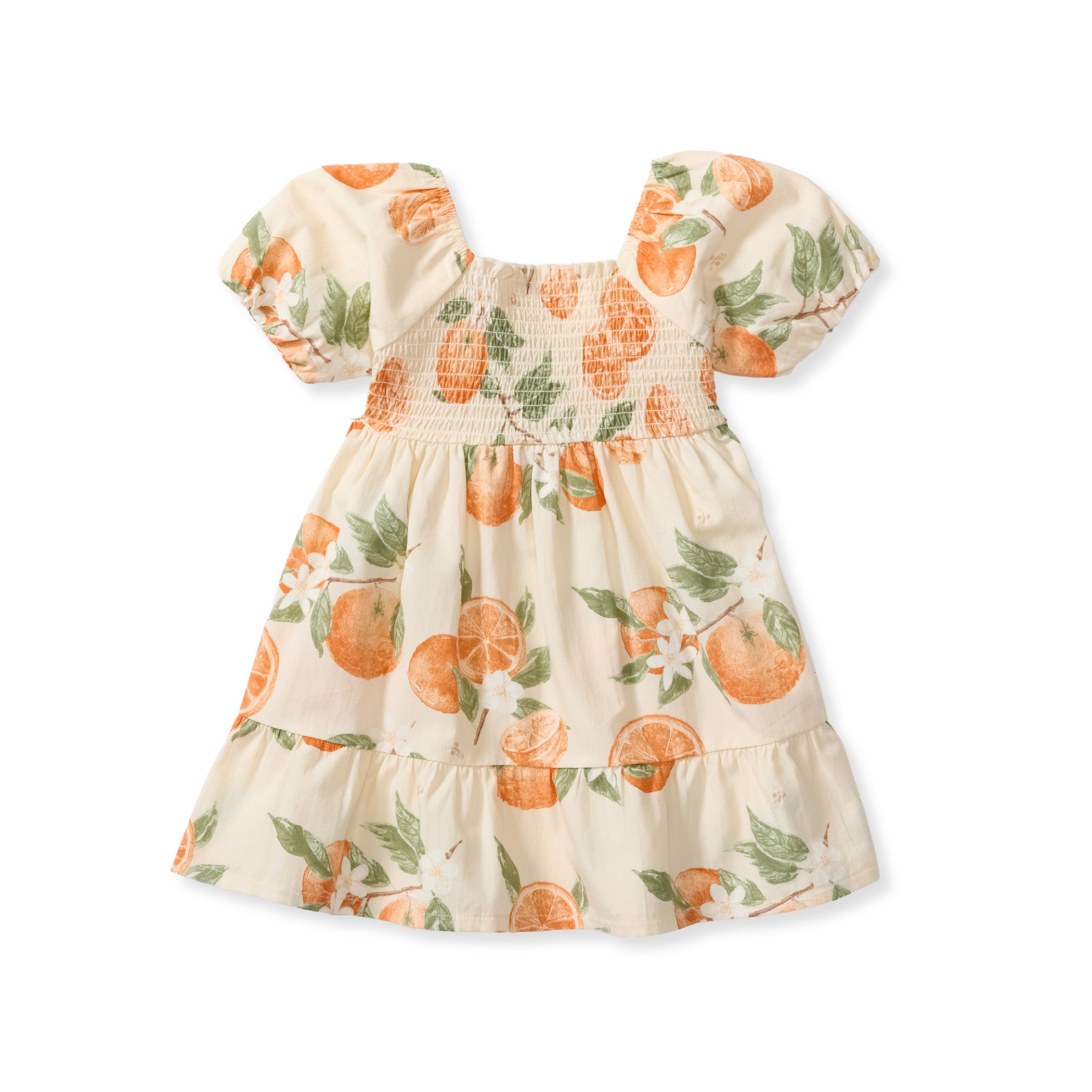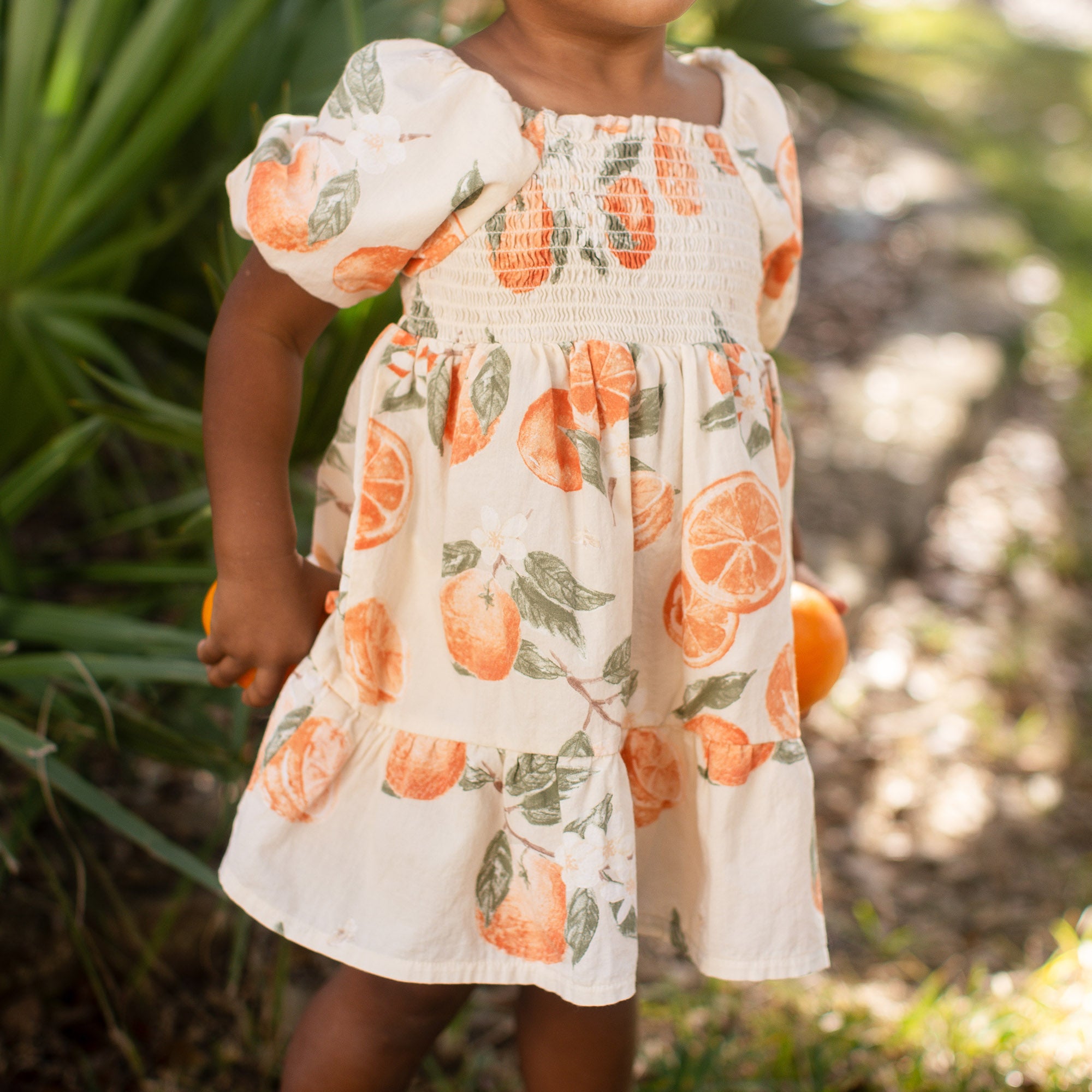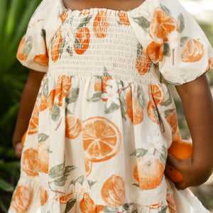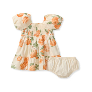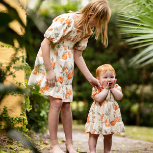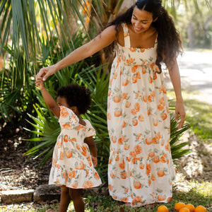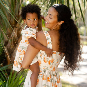 Your little golden girl will light up in this painted-oranges smocked dress, made even sweeter when she discovers she can match with Mama. Soft puff sleeves and a coordinating diaper cover (infant only!) make it perfect for twirling and all your “Just like Mama” moments together.