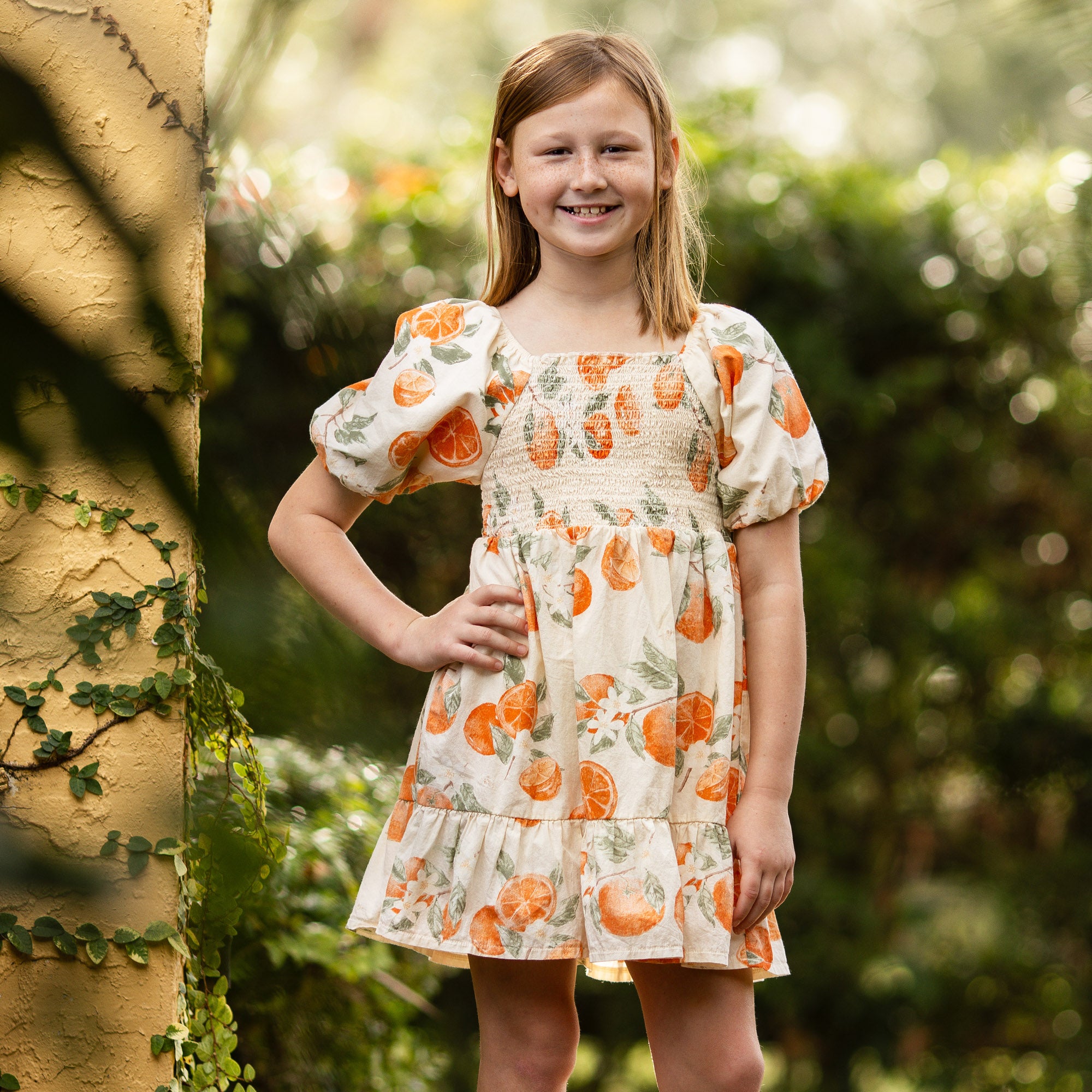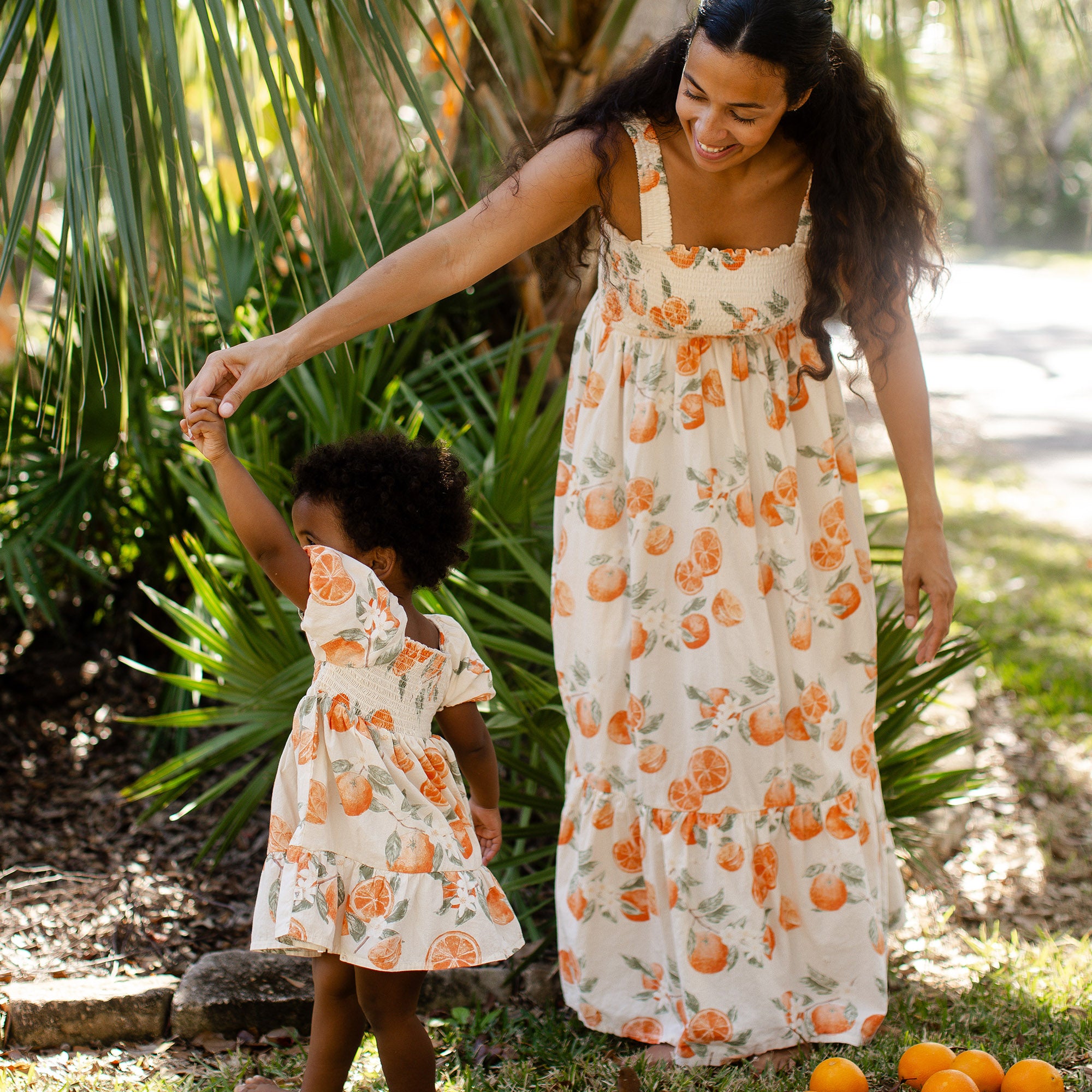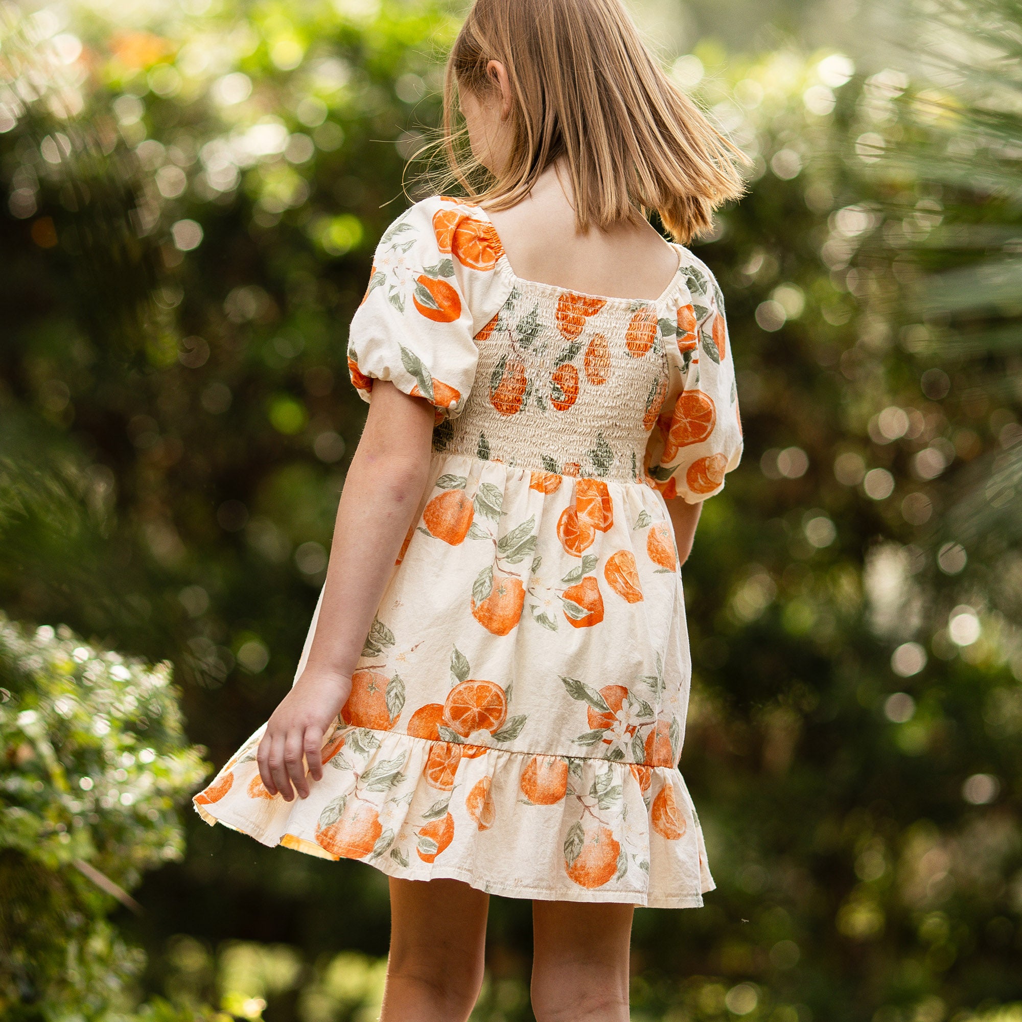 Your little golden girl will light up in this painted-oranges smocked dress, made even sweeter when she discovers she can match with Mama. Soft puff sleeves and a coordinating diaper cover (infant only!) make it perfect for twirling and all your “Just like Mama” moments together.