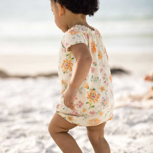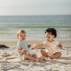 This sweet romper set brings breezy comfort and soft summer fun to every day. The hand‑painted Mediterranean Floral romper is made from cozy jersey fabric that’s soft, simple, and perfect for all‑day play. The solid romper is crafted from our textured honeycomb muslin - super lightweight and sweet for any warm‑weather adventure. With easy snap openings for quick diaper changes, this darling duo is ready for sunshine, snuggles, and the perfect day ahead.