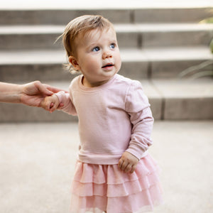 Soft, sweet, and effortlessly charming — this pink sweatshirt dress with its fluttery ruffled skirt is perfect for playdates, picture days, and everything in between.