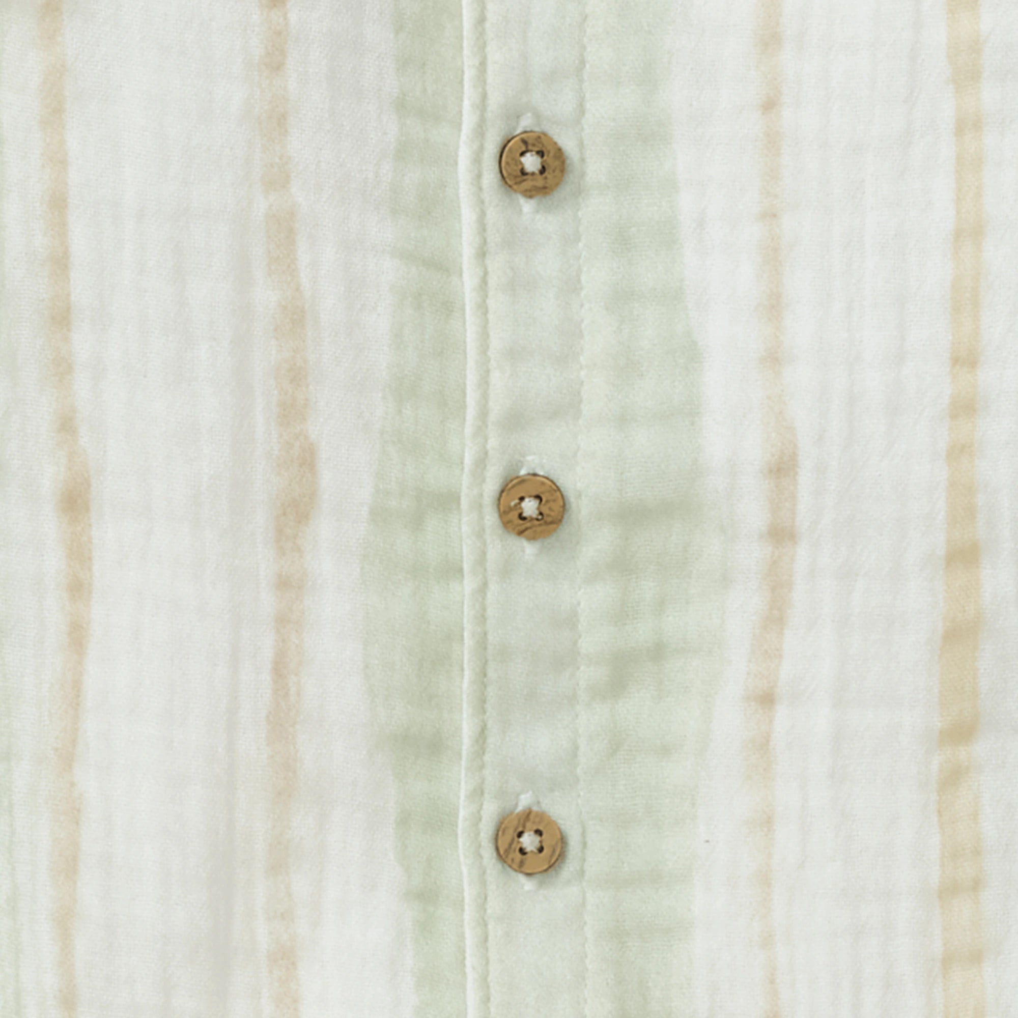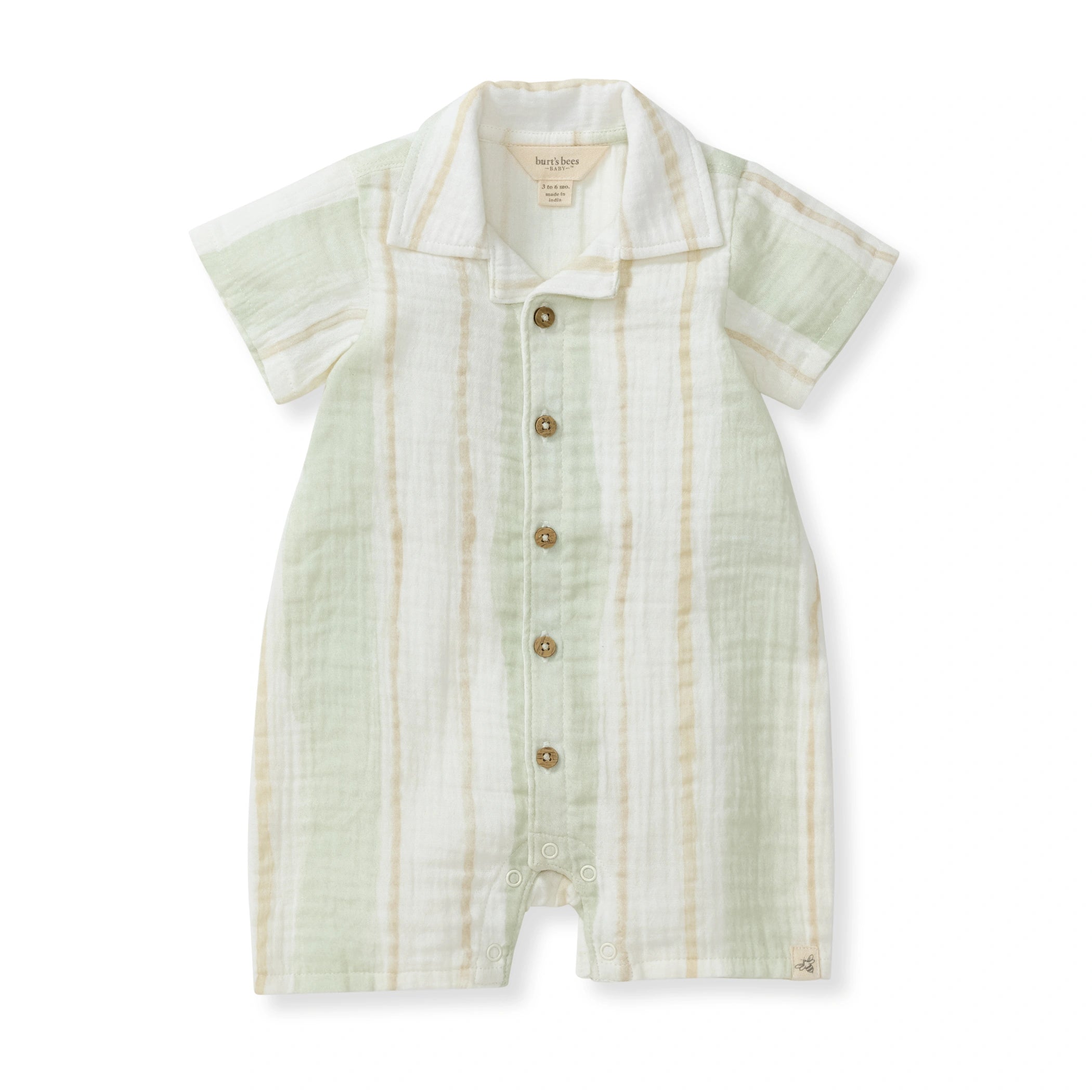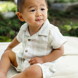 Light and airy, this classic gauze romper features a watercolor painted stripe print inspired by soft earthy hues. Easy buttons down the front and quick inseam snaps keep spring days carefree and comfortable.