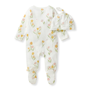 Wrap your baby in springtime softness with this tulip-print jumpsuit and coordinating knot hat — made from breathable organic cotton for all-day comfort.