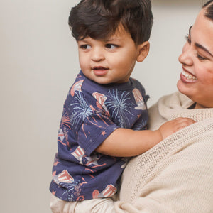 Watercolor stars, fireworks, and festive hats are a fun pop to this slouchy jersey tee, paired with soft french terry shorts for any festive summer occasion.